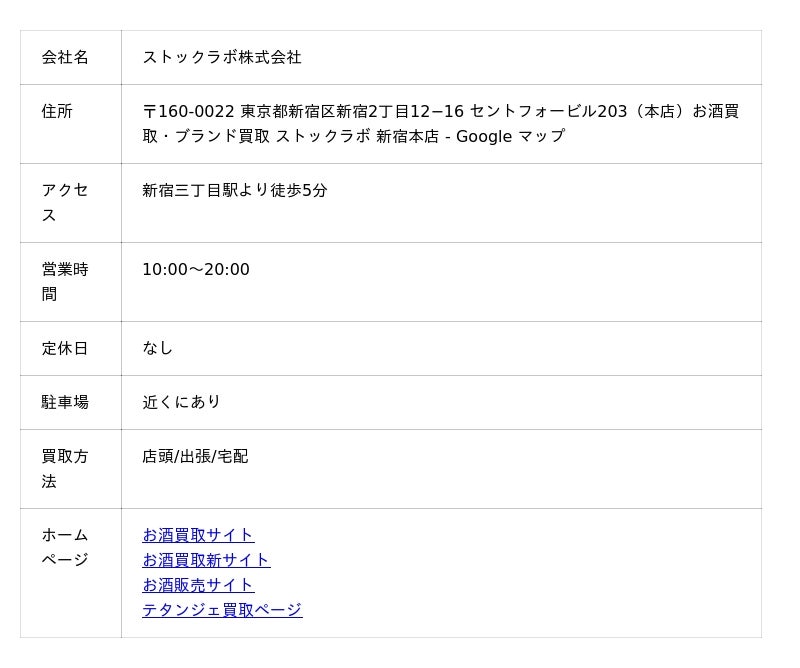 お酒買取専門店ストックラボのテタンジェ買取の特徴を3つに分けて解説します。まずは、ストックラボの業者の概要をご確認ください。
