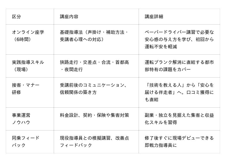 声掛けや補助ハンドルのタイミング、ペーパードライバー心理への対応、接客マナー、料金設定、保険や契約、口コミ管理やMEO対策といった運営スキルまで、幅広い知識を身につけます。