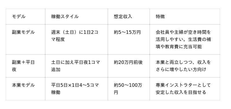 東京ドライビングサポートの指導員養成講座は、副業から本業まで幅広い働き方に対応しています。ライフスタイルや収入目標に合わせて稼働時間を調整できるため、会社員・主婦・セカンドキャリア世代まで柔軟に取り組めます。