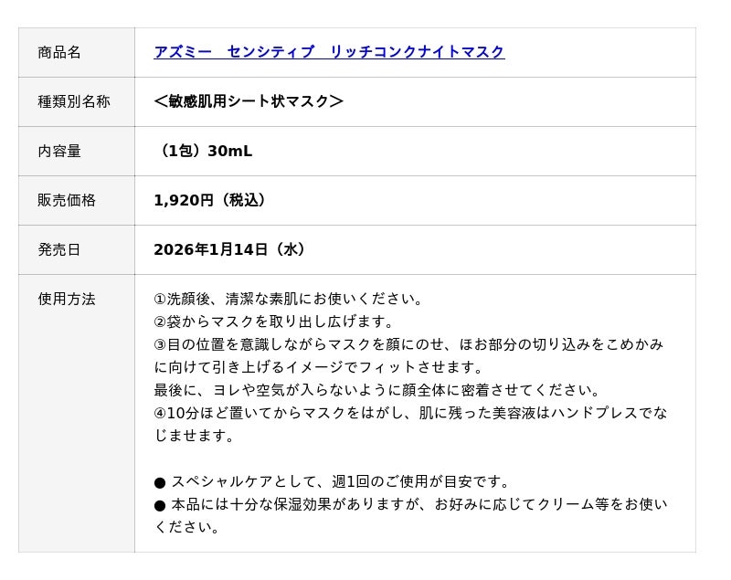 「アズミー センシティブ リッチコンクナイトマスク」2026年1月14日(水) 新発売