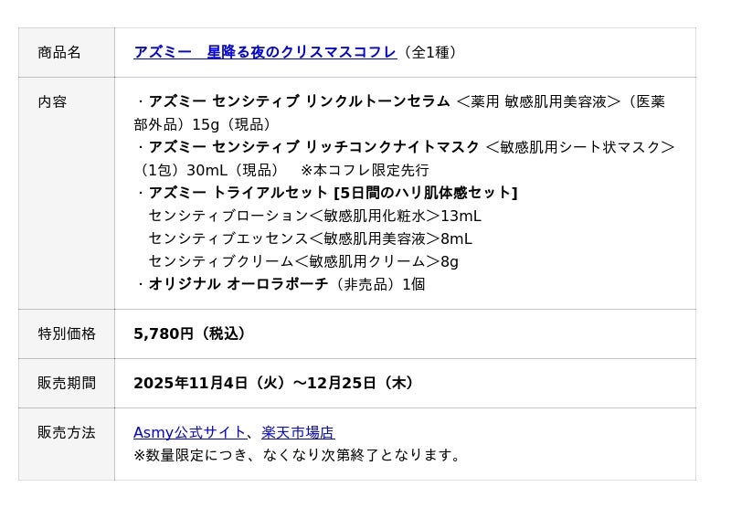 「アズミー センシティブ リッチコンクナイトマスク」を発売前に先行体験できる「アズミー 星降る夜のクリスマスコフレ」を2025年11月4日(火)より数量・期間限定で発売いたします。