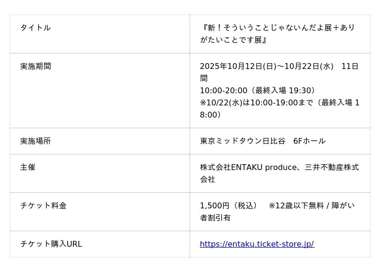 三井不動産株式会社(東京都中央区、代表取締役社長:植田俊)は、東京ミッドタウン日比谷 (千代田区有楽町、事業者:三井不動産株式会社)で、2025年10月12日(日)~22日(水)の11日間、「新!そういうことじゃないんだよ展+ありがたいことです展」を株式会社ENTAKU produceと共同開催いたします。