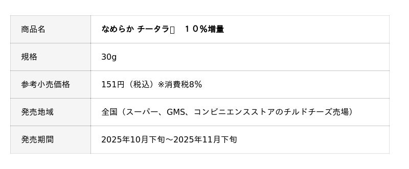 この度、日頃より「なめらか チータラ(R)」シリーズをご愛顧いただいております皆様に感謝を込めて、「なめらか チータラ(R)」シリーズ5品を期間限定で10%増量し、発売いたします。この機会にぜひ、お楽しみください。