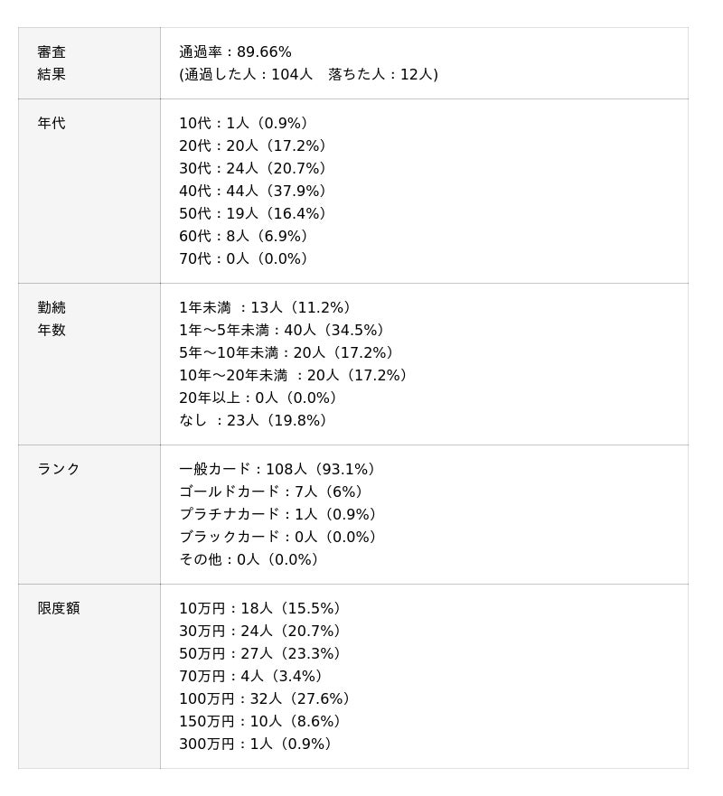 年代は10~60代まで広がりがありましたが審査に通過した方は勤続年数が1年~10年未満と比較的勤続年数が長い方が多いといえるでしょう。