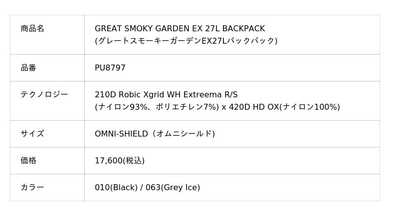 GREAT SMOKY GARDEN EXシリーズは全3型、各2色展開で、その全てにコロンビア独自のはっ水機能“OMNI-SHIELD(オムニシールド)”を搭載しています。本体の素材には強度と耐久性に優れた「ROBIC」ナイロンの210デニールに超高分子量ポリエチレン繊維である「EXTREEMA」を格子状に組み合わせた生地を採用。 カジュアルな見た目とは裏腹に高レベルの強度と弾性率を有し、今まで以上にさまざまなシチュエーションに対応できるアイテムに仕上がりました。