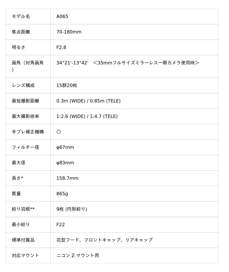 クラス最小・最軽量*タムロン70-180mm F/2.8 Di III VC VXD G2 (Model A065) 手ブレ補正機構を搭載した「ニコン Z マウントシステム」対応大口径望遠ズームレンズ