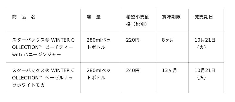 スターバックス・コーポレーション(本社:米国 シアトル、CEO:ブライアン・ニコル)と、サントリー食品インターナショナル株式会社(本社:東京都、社長:小野真紀子)は、「スターバックス(R) WINTER COLLECTION(TM) ピーチティー with ハニージンジャー」「同 ヘーゼルナッツホワイトモカ」を、全国のセブン-イレブン限定で10月21日(火)から発売します。