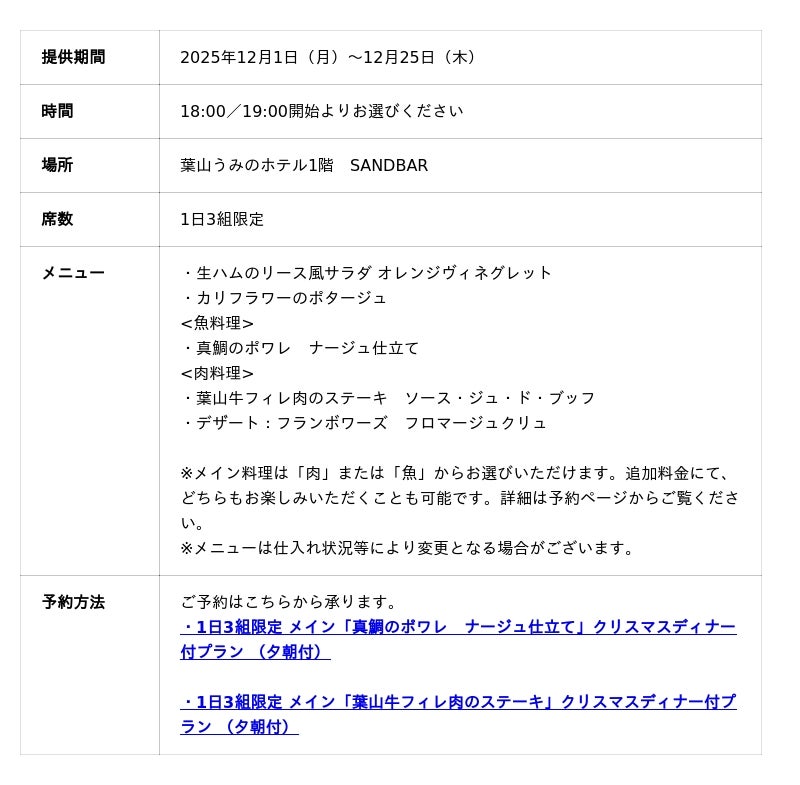 シマダグループ(本社:東京都渋谷区、代表:島田成年)の一社であるシマダハウス株式会社が運営する「葉山うみのホテル」(神奈川県三浦郡葉山町)では、10月21日(火)よりクリスマスディナーコース付き宿泊プランの販売を開始いたします。