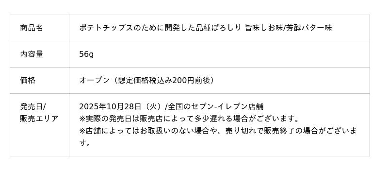 カルビー株式会社(本社:東京都千代田区、代表取締役社長兼CEO:江原 信)は、カルビーグループが10年以上かけて独自に開発したジャガイモ品種「ぽろしり」を使った新商品『ポテトチップスのために開発した品種ぽろしり 旨味しお味/芳醇バター味』を2025年10月28日(火)より全国のセブン‐イレブン店舗で数量限定発売します。※なくなり次第、終了。