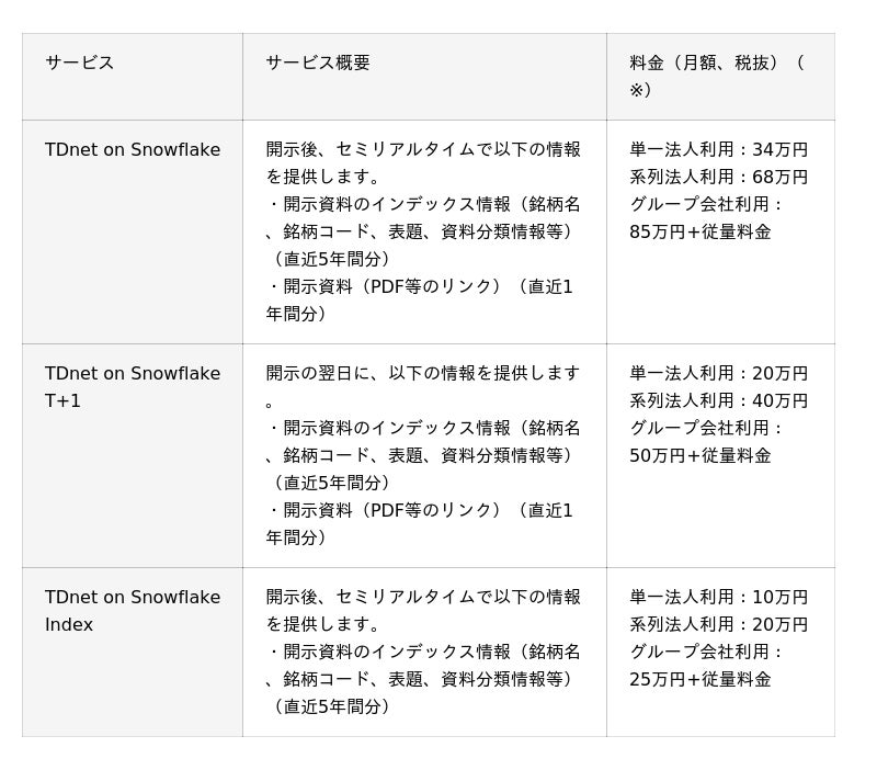 - TDnet on Snowflake(https://www.jpx.co.jp/markets/paid-info-listing/tdnet/04.html)