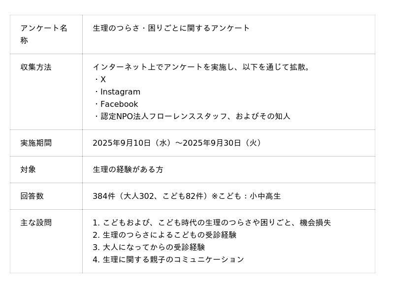 近年、大人の生理にまつわる課題は社会的に注目されつつありますが、こどもが抱える困りごとや機会損失については、十分に知られていません。今回のアンケートでは、こどもの生理にまつわるつらさや声を可視化することを目的に、SNSなどを通じてインターネット上で、生理の経験がある成人・こども(小中高生)の声を集めました。