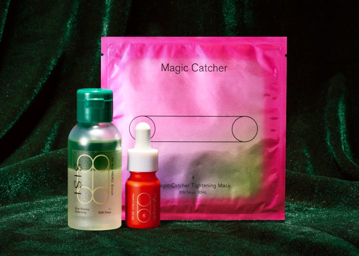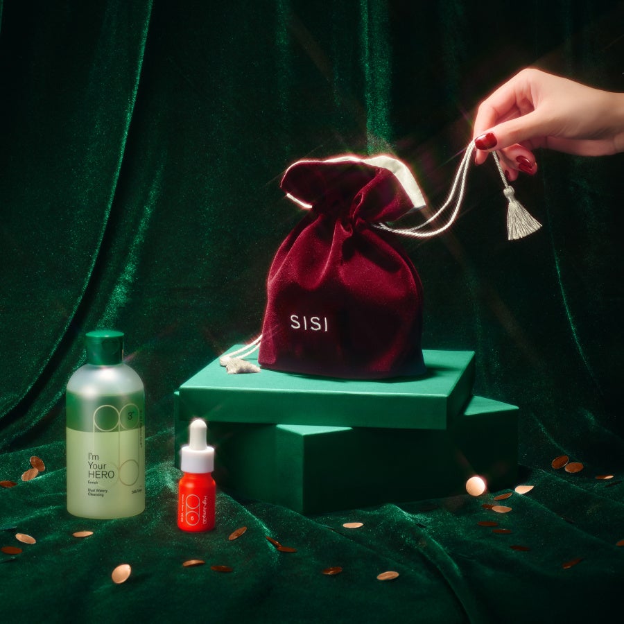 本コレクションでは、SISI人気アイテムの「アイムユアヒーロー〈拭き取りクレンジング〉」と「ハイジャンプ30〈ビタミンC美容液〉」を含む、3つのセットを展開。オリジナルベロアポーチも数量限定で付属する、ホリデーカラーに包まれた特別なセットです。