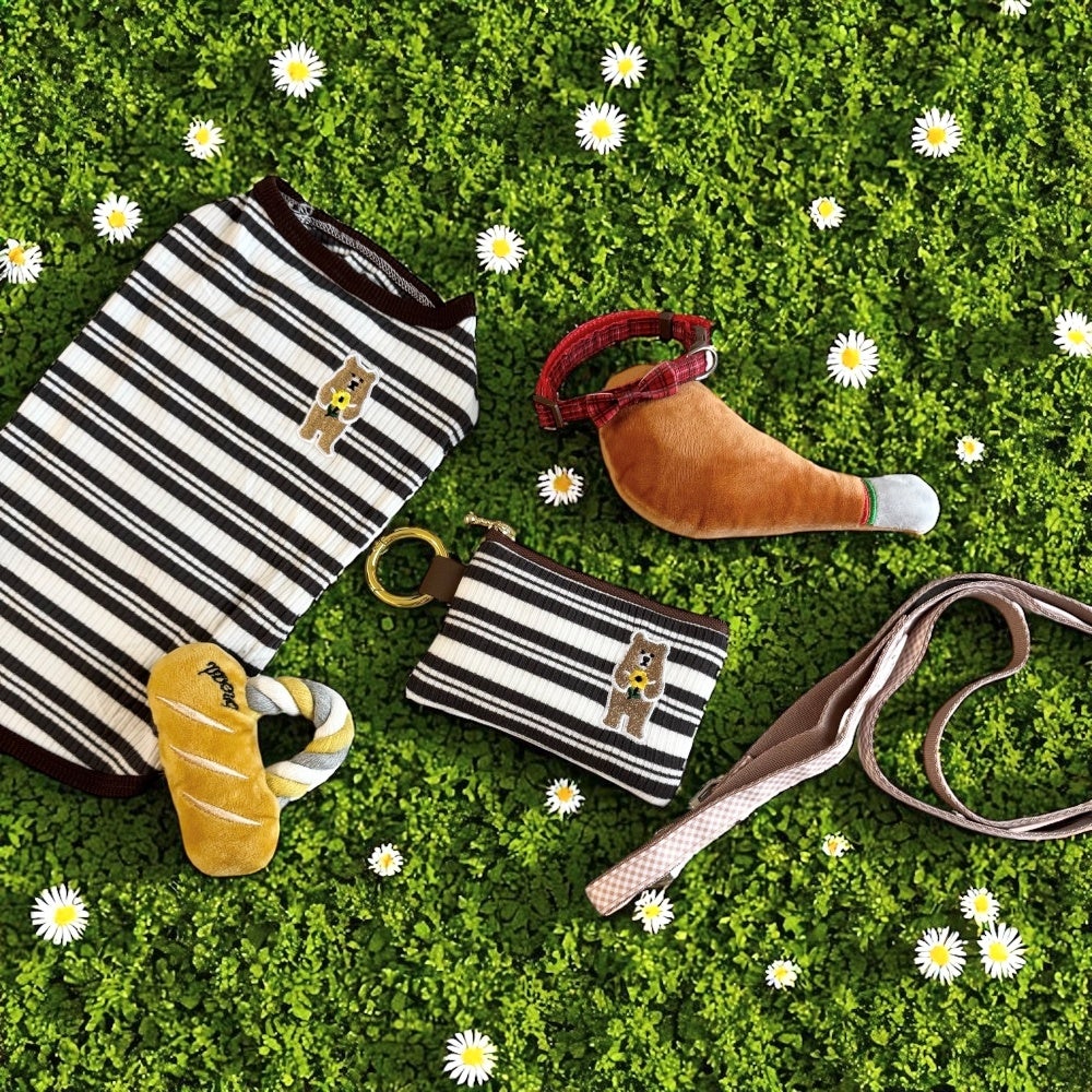 ペットの服や愛用していたブランケットを5点の布小物にリメイク。柄の特徴やシミを活かしたデザインで生まれ変わります。