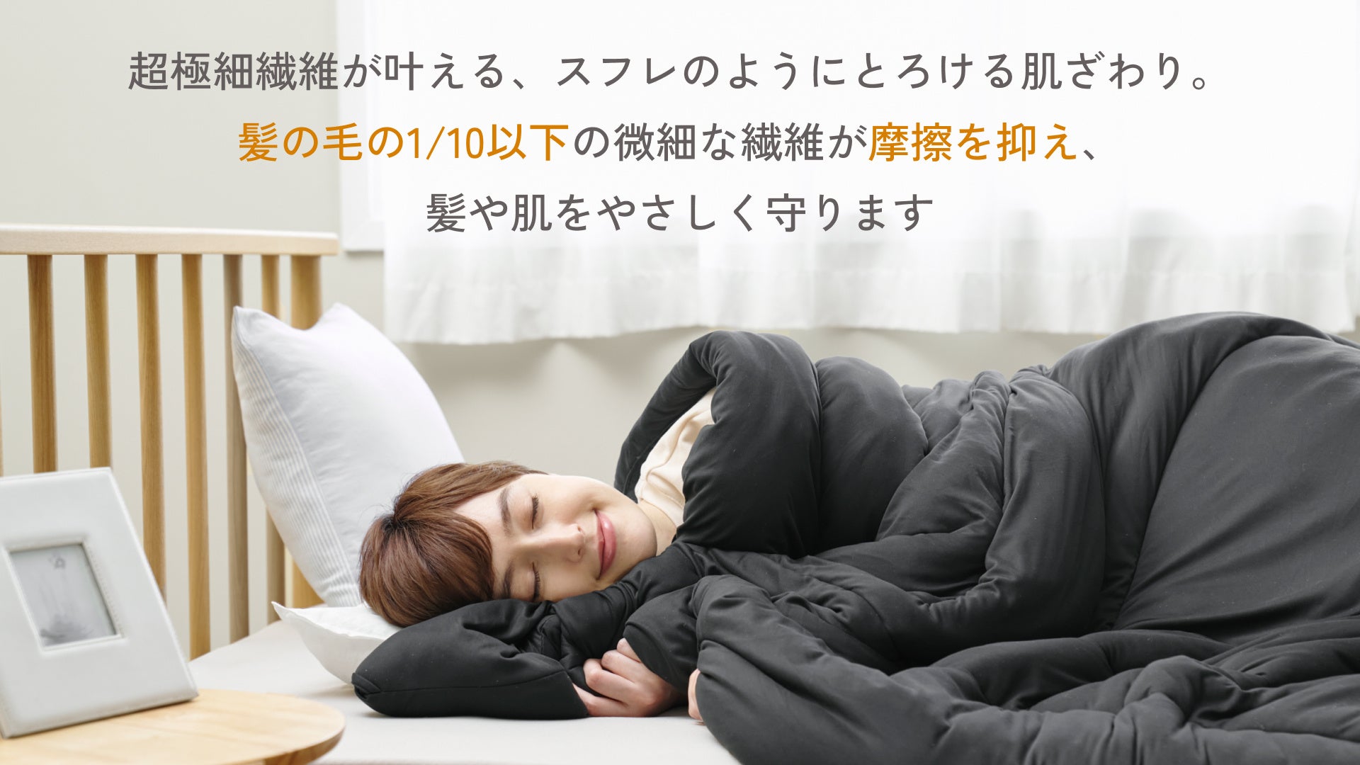 髪の毛の1/10以下という極細繊維を高密度に編み上げた、マイクロニット生地を採用。素肌にすべるような“とろけるタッチ”で摩擦を抑え、肌や髪への刺激を最小限にやさしく守ります。触れた瞬間に心までほぐれる、スフレのようになめらかな質感を実現しました。