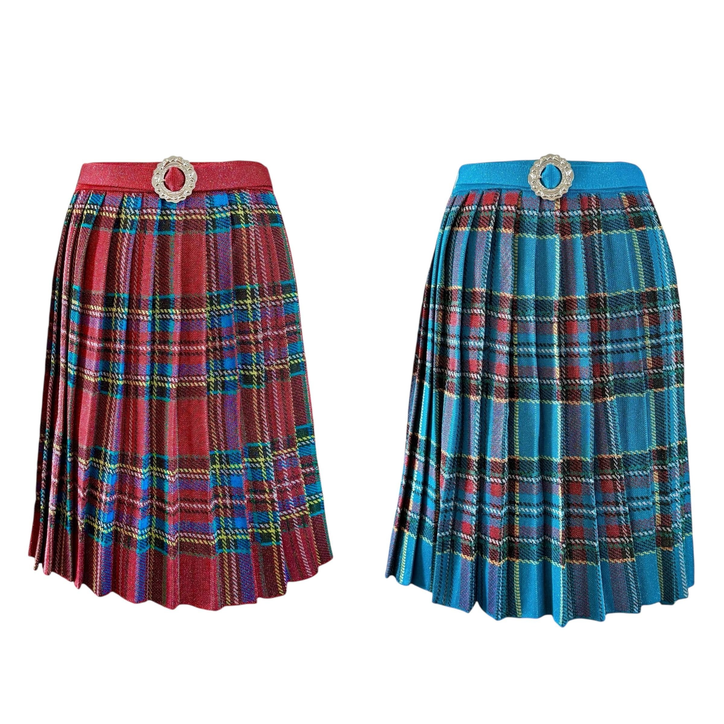 全てラメ糸を使用して編み上げられたプリーツニットスカート。 オリジナルのタータンチェック柄が動くたびに煌びやかに光ります。