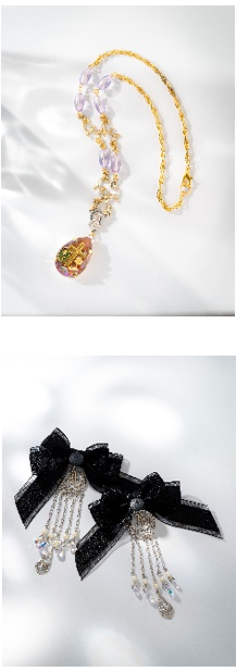 貴和クリスタルを使用したものをはじめ、3 本のネックレスを組み合わせることで、ボリューム感を出したアイテムです。その日のスタイルに合わせて組み合わせ、自由に身に着けていただけます。