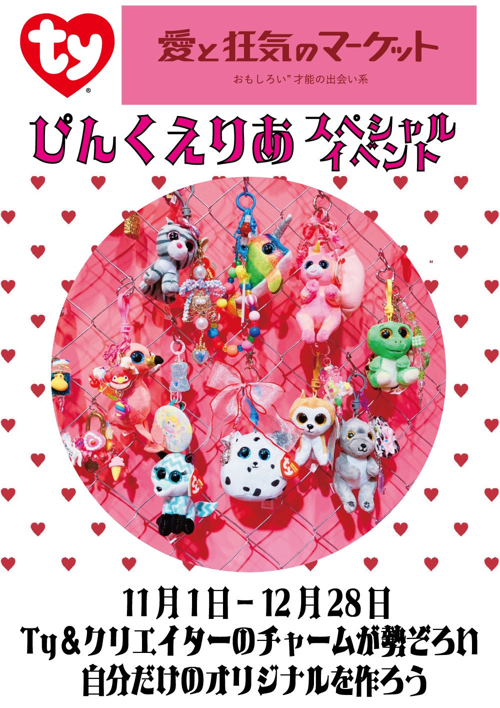 愛と狂気のマーケットと、世界最大のぬいぐるみブランド「Ty」がコラボレーション。「ぴんくえりあ」に出品しているクリエイターのハラジュクPOPなアイテムとTyのぬいぐるみを組み合わせて、自分だけのバッグチャームを作っていただけます。
