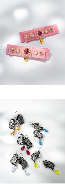 きらきらと輝き揺れるいくつものパーツ・クリスタルがオリエンタルな雰囲気を醸し出す、2個1組のリボンクリップセットです。ルーシッドリボンの中央には飾り釦をあしらい、怪しい月を思わせる円形パーツの中央にはPIRATESオリジナルAPチャームをプラス。ゴシックな装いにもオススメの一品です。