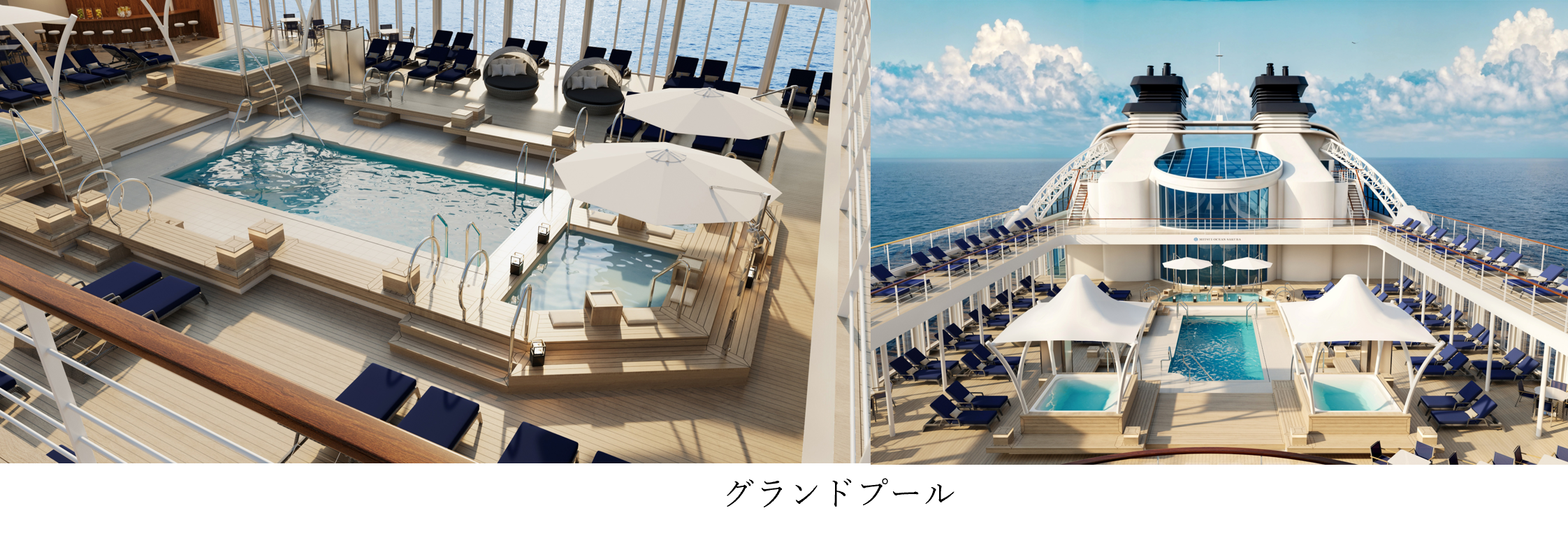 デッキ8の中央に位置する「グランドプール」では、開放感あふれる船上のリゾート空間を感じていただけます。MITSUI OCEAN FUJI(以下、三井オーシャンフジ)と同様に、2つの温水ワールプールや周囲にデッキチェア、テーブルを完備しております。また、三井オーシャンサクラの「グランドプール」には新たに足湯が登場します。足湯の座席にはお飲み物やタオルなどをお持ちいただける小さなテーブルが設けられています。洋服をお召しになったままご利用いただけるため、観光やアクティビティの合間のご利用もおすすめです。洋上で風を感じながら日本の四季や景色をご堪能ください。グランドプールに隣接する屋外の「プールサイドテラス/プールサイドバー」では、カジュアルにお召し上がりいただけるお料理をご用意しております。バーには「美と健康」をテーマに、季節のフルーツや野菜を選んでオリジナルスムージーを作ることができるコーナーを設置予定です。