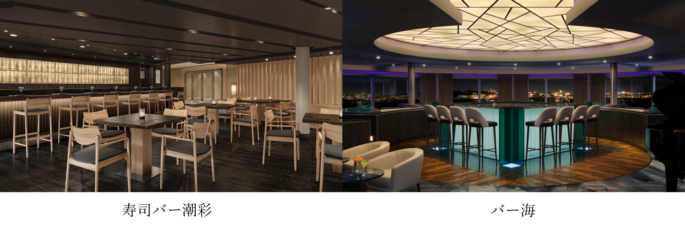 また、船内にはカウンター席とテーブル席の双方を備え、お寿司や小皿料理、日本酒をお召し上がりいただけるスペシャルレストラン「寿司バー潮彩(しおさい)」をご用意いたします※2。数貫のお寿司を気軽に味わうことも、シェフとの会話を楽しみながら、ゆったりとしたひとときをお過ごしいただくことも可能です。夕食後はバーとしても営業し、隣接するオーシャンクラブ&バーで行われるライブやエンターテインメントに日本酒やカクテルで華やぎを添えます。