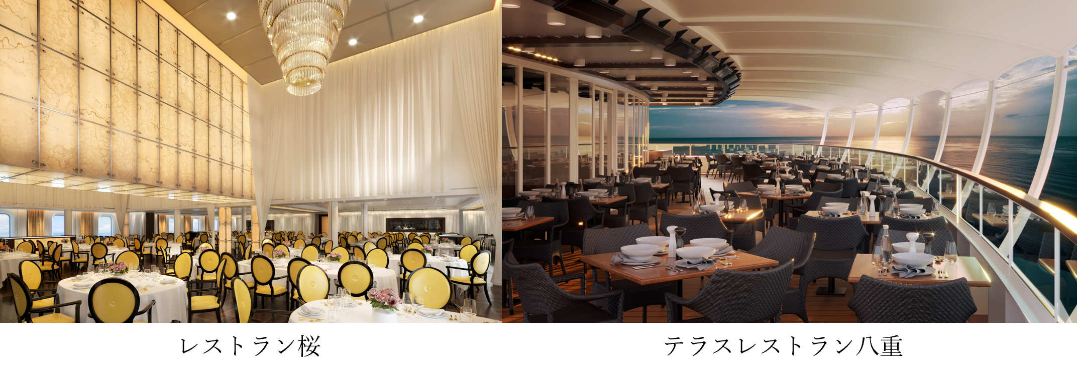 「テラスレストラン八重(やえ)」では季節や寄港地の食材などを取り入れたお料理を、ビュッフェスタイルでご提供いたします※1。和食に加え、洋食やアジア料理など、地球を何周も航海してきたシェフだからこそ生み出せる、豊かなメニューの数々を日替わりでご用意いたします。お好きな量をお好きな味で目の前で調理するライブキッチンを実施するスペシャルコーナーも設置いたします。船の最も後方に位置するテラス席で、移りゆく海と空とともにお食事をお楽しみください。