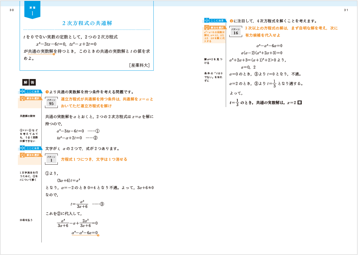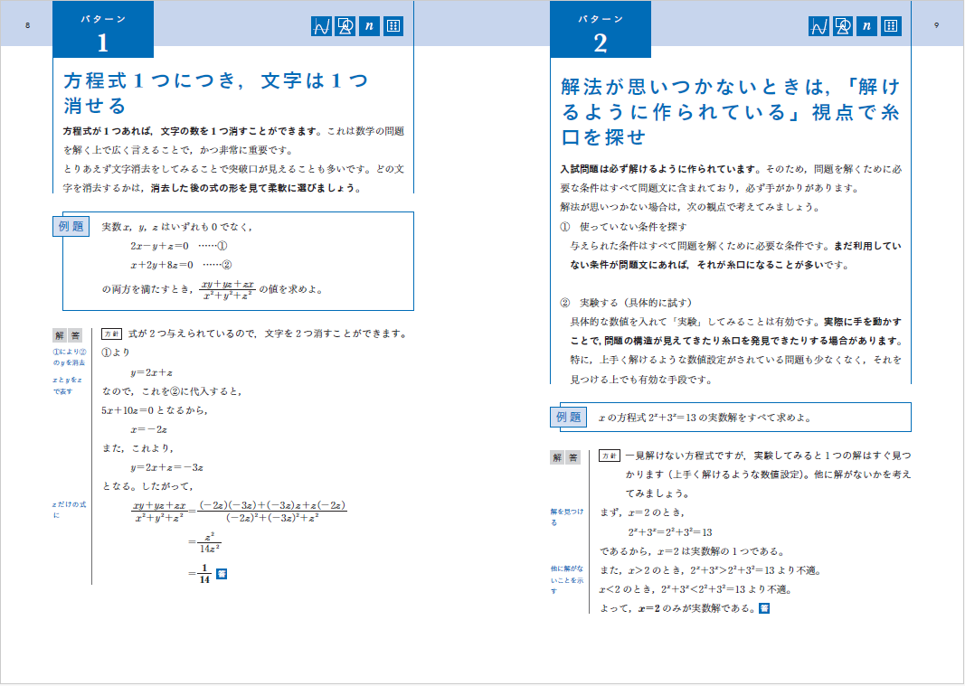 ▲パターン集。入試で役立つ、汎用性の高い考え方や解法のパターンを157掲載。各パターンには例題がついており、適切なタイミングで正しい解法を選び、使う力が身につく。