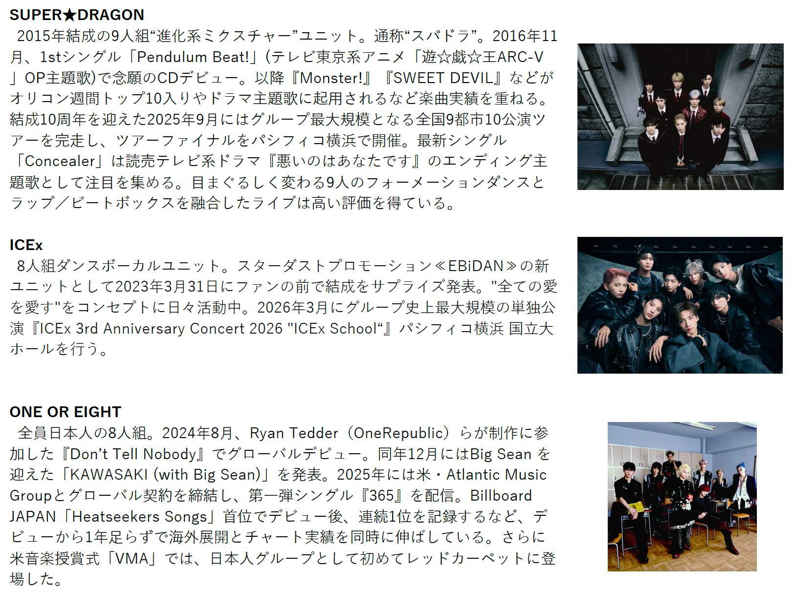 アーティスト:SUPER★DRAGON、ICEx、ONE OR EIGHT ほか
