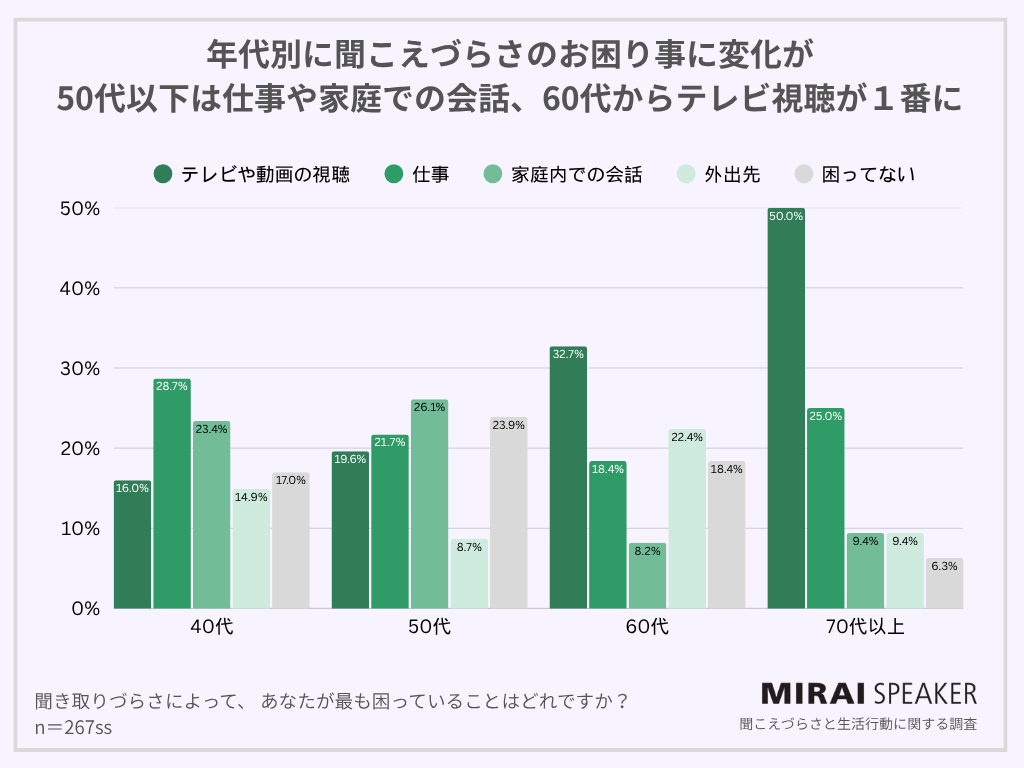 年代別に見ると、40代は「仕事」、50代は「家庭内での会話」、60代以上では「テレビや動画の視聴」が突出し70代では約半数が困っていると回答しました。一方、「外出先で困る」割合は60代が他の年代と比べて最も高くなっています。