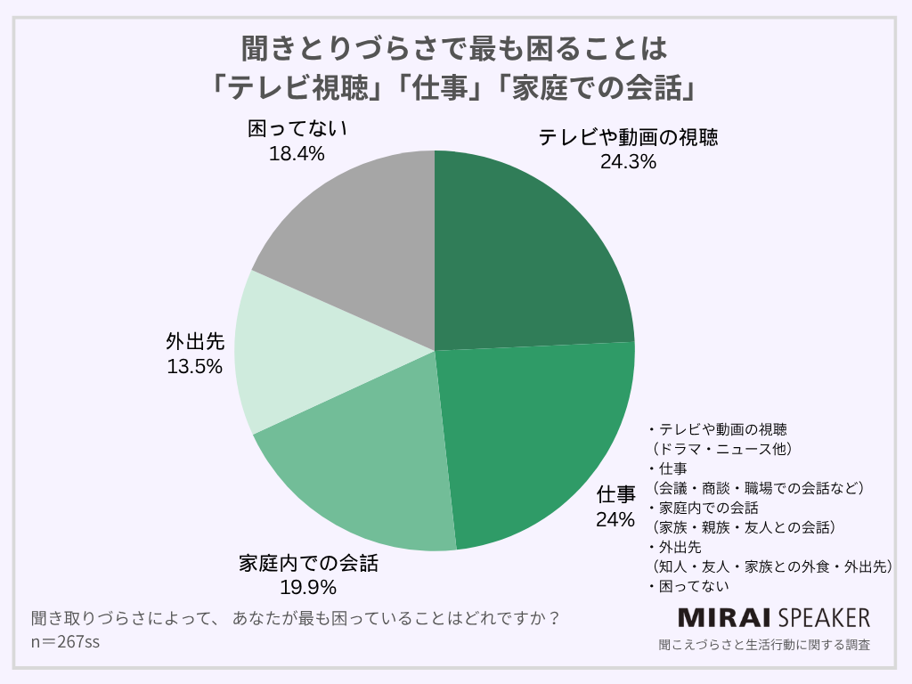 聞こえづらさで最も困るのは「テレビや動画の視聴」、続いて「仕事」や「家庭内での会話」