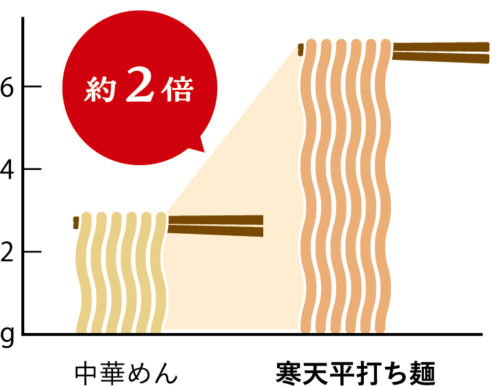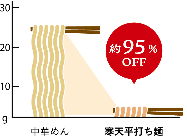 日本食品標準成分表(八訂)増補2023年版における「中華めん ゆで」と比較すると、湯戻し寒天麺(麺のみ)は糖質約95%カット、カロリー約85%カット。食物繊維を約2倍含んでいます。