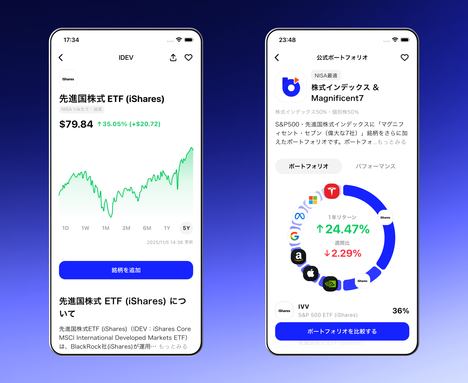 「先進国株式ETF(IDEV)」は、米国を除く先進国市場の大型株・中型株・小型株で構成される、国際的な分散投資をしながら長期成長を目指すETFで、運用残高は200億ドル※を超えています。これにより、既にブルーモで取扱いのある「S&P 500 ETF(IVV)」と合わせて、NISAつみたて投資枠の中でカバーできる株式の対象地域が広がり、お客様にとって、ブルーモのNISAがより使いやすいものとなりました。