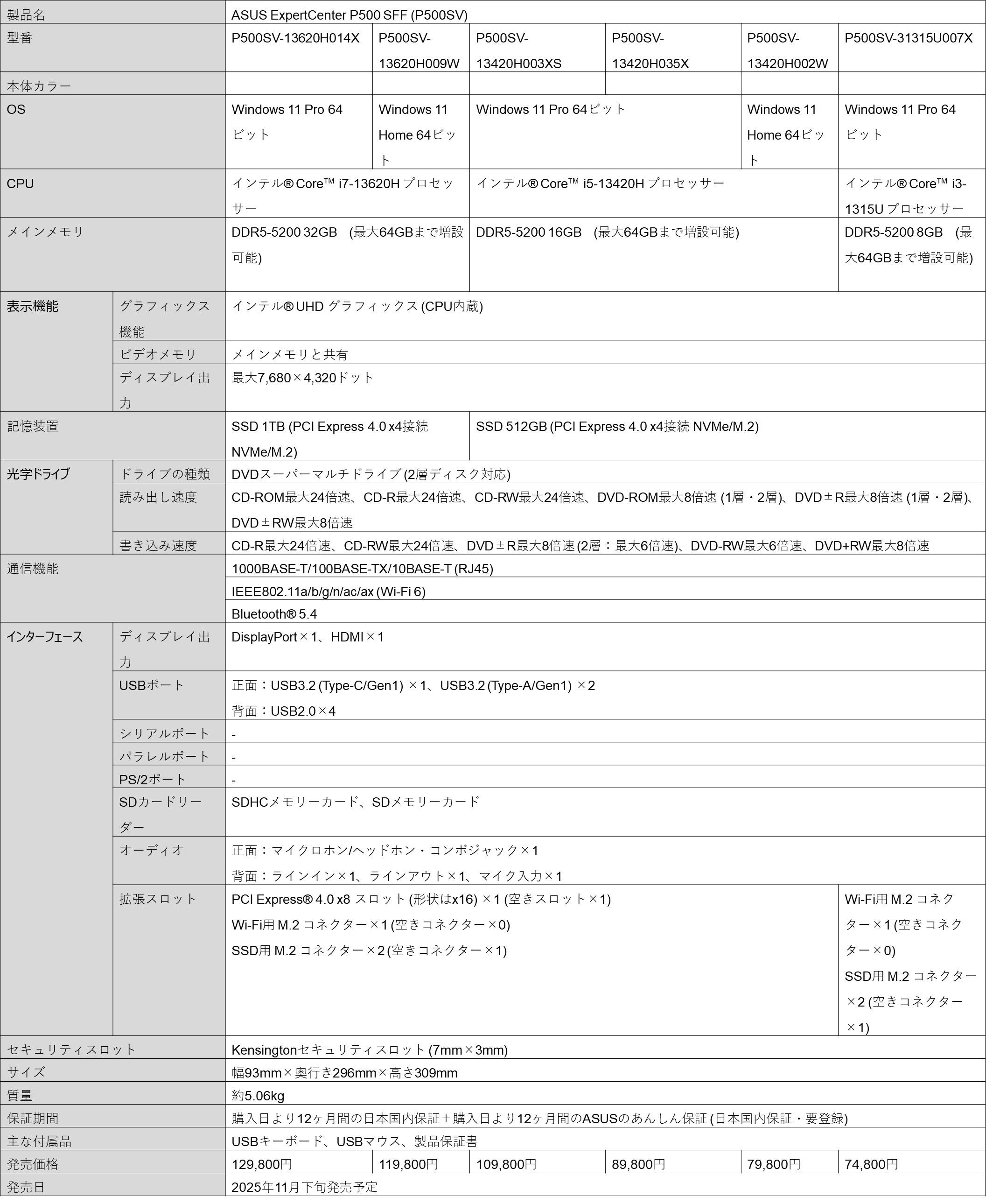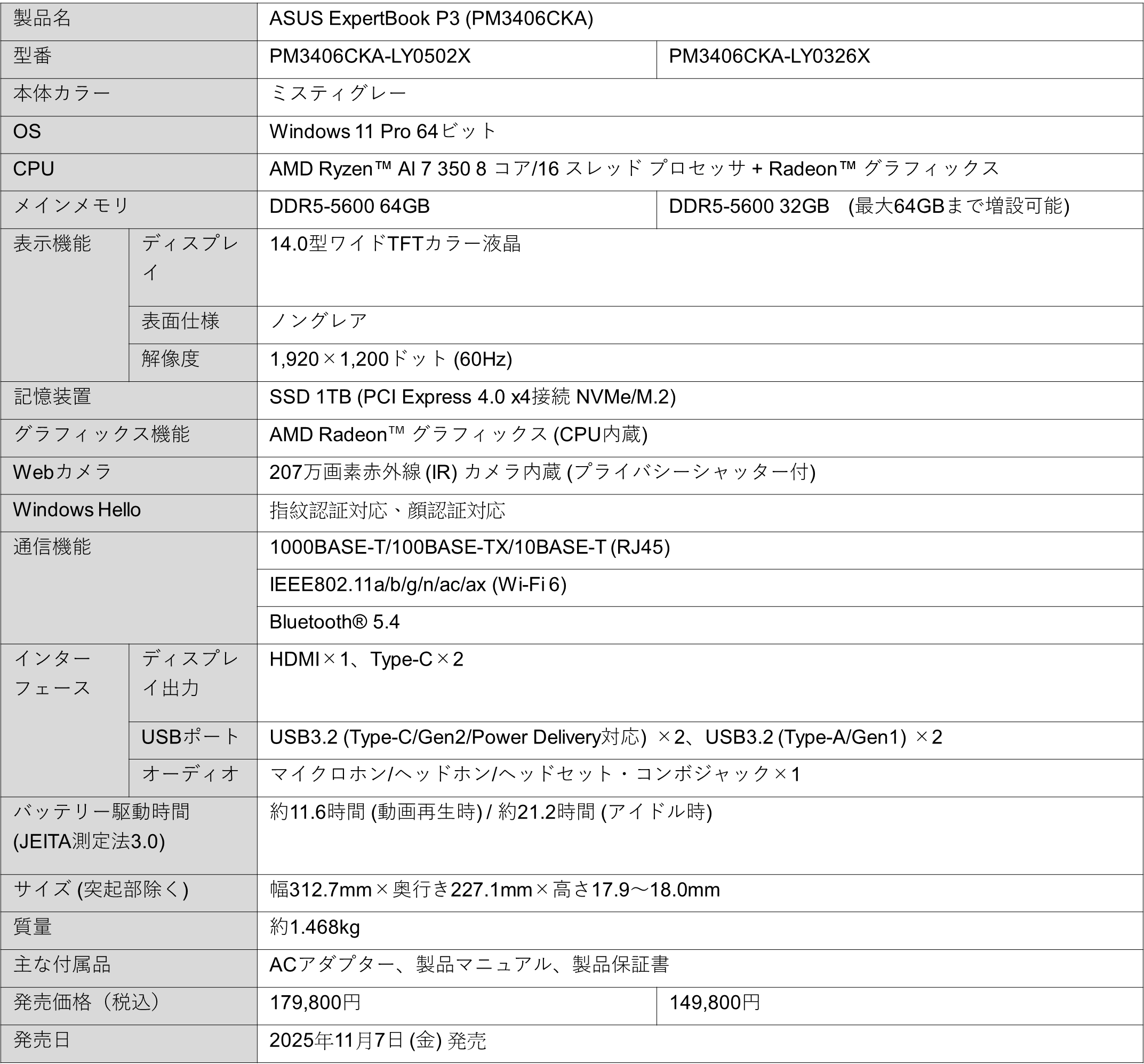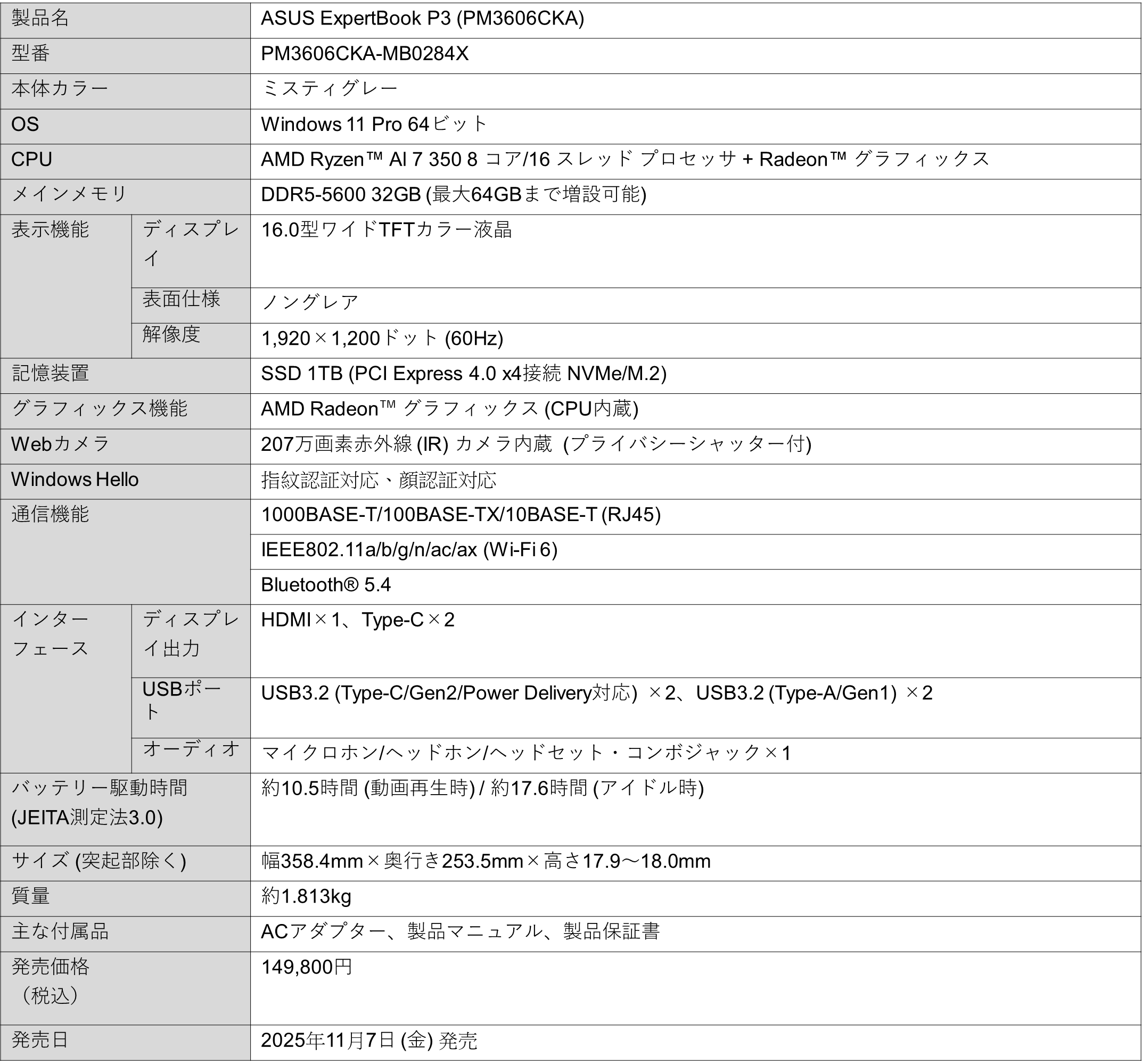 ASUS JAPAN株式会社は、本日、ビジネス向けノートPC「ASUS ExpertBook P3シリーズ」の発売、および小型デスクトップPC「ASUS ExpertCenter P500 SFF (P500SV)」6モデルのスペックの追加を発表しました。マルチタスクを可能にする高性能 CPU、AMD Ryzen AI プロセッサを搭載し、NPU最大50 TOPSを実現する Copilot+PC に準拠したノートPC「ASUS ExpertBook P3シリーズ」と省スペースで拡張・メンテナンスも簡単な設計が特長のビジネス向け小型デスクトップPC「ASUS ExpertCenter P500 SFF」をラインアップし、さまざまなビジネスシーンにおける生産性向上と快適な作業環境の実現を支援します。ビジネス向けノートPC「 ASUS ExpertBook P3シリーズ」は本日2025年11月7日 (金)よりASUS Storeより販売を開始します。ビジネス向け小型デスクトップPC「ASUS ExpertCenter P500 SFF (P500SV)」追加6モデルは11月下旬に発売します。