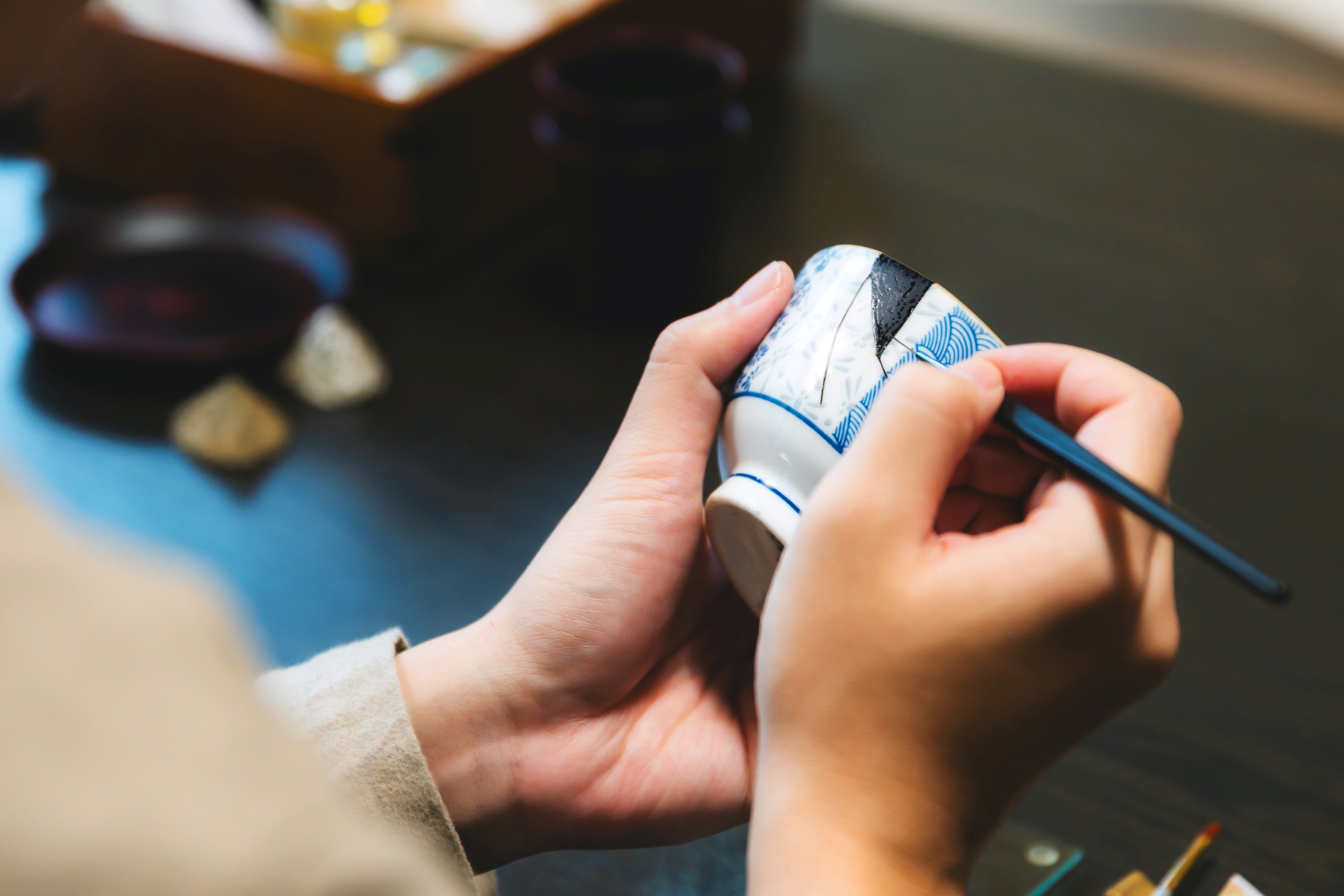 「金継」は日本で生まれ、15世紀ごろから行われてきた技法です。壊れた陶磁器を生漆と金粉や銀粉でつなぎ、再び使えるようにしながら、修復の跡を美しく見せます*3。本プランで体験するのは、割れた器のつなぎ目を漆で補い、その上に金粉をのせて仕上げる工程です。完成した作品は、自分の手で修復した温かみのある芸術品として持ち帰ることができます。