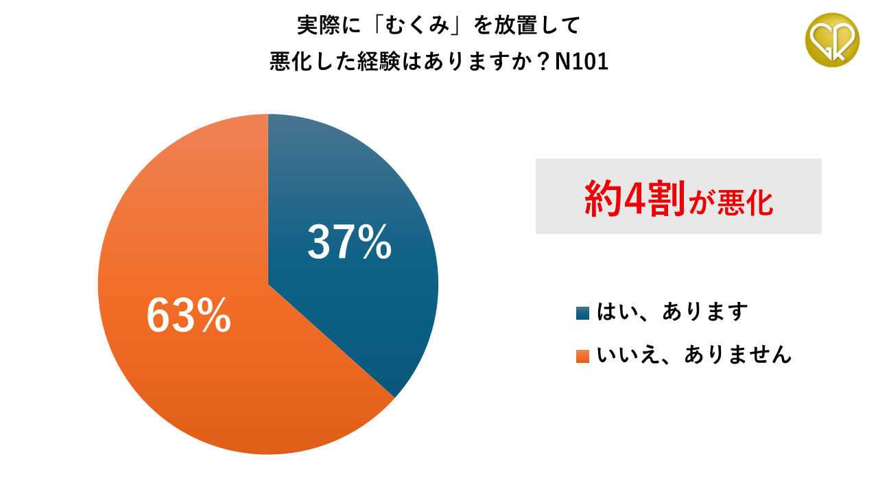 続いて「むくみを感じた事がない」方を除いた101人に対して、「実際に「むくみ」を放置して悪化した経験はありますか?」と質問したところ、「はい、あります」が37%(37人)、「いいえ、ありません」が63%(64人)という結果で約4割が「むくみを放置して悪化した」と回答しました。