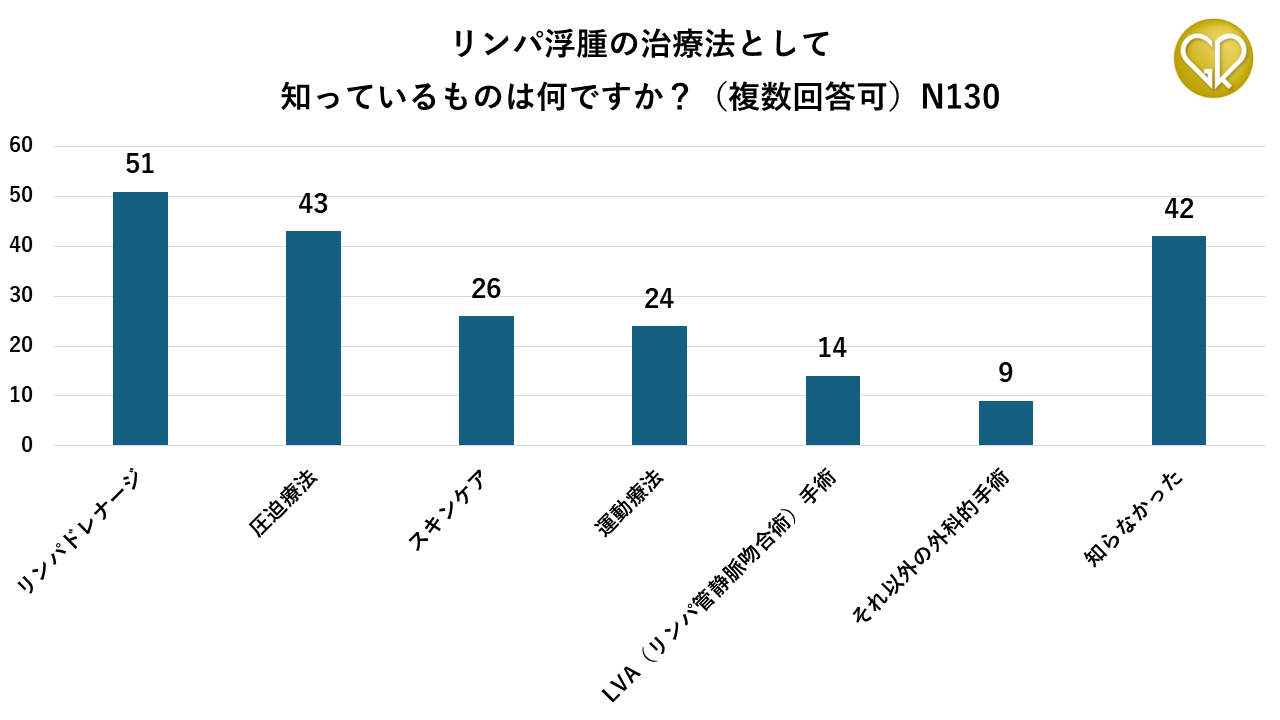 がん患者130人に対して、「リンパ浮腫の治療法として知っているものは何ですか?」(複数回答可)と質問したところ、一番多い回答が「リンパドレナージ(リンパマッサージ)」で39%(51人)、次が「圧迫療法(弾性ストッキングなど)」で33%(43人)とこの2つが3割を超えている状況でした。