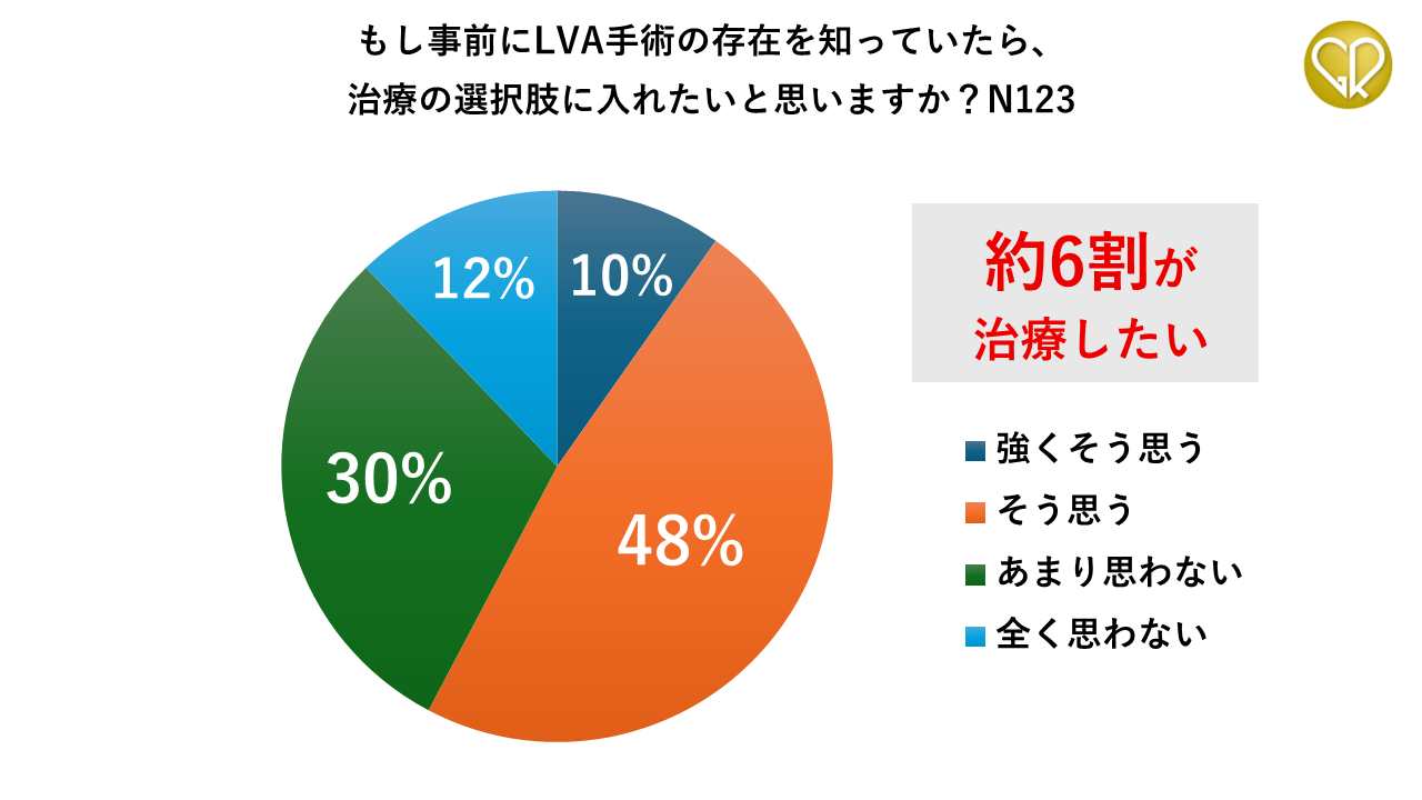すでにLVA手術を経験する患者さん7名を除く123人に対して質問したところ、説明を受けたうえで「治療の選択肢に入れたい」と回答した女性は6割(58%)を超えました。「LVA手術を受けた後、正しいケアを続けていく事で生活の質向上に期待が持てます。患者さんだけでなく、その家族や友人、多くの人にメディアやインターネットを通じて、さらなる情報発信の重要性を感じています」(永尾光一医師)。