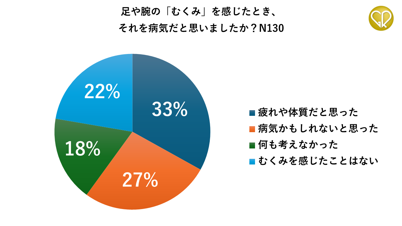 女性のがん患者130人に対して「足や腕の「むくみ」を感じたとき、それを病気だと思いましたか?」と質問したところ、「むくみを感じた事がない」22%(29人)を除き、「疲れや体質だと思った」が33%(43人)、「病気かもしれないと思った」が27%(35人)、「何も考えなかった」が18%(23人)という結果でした。