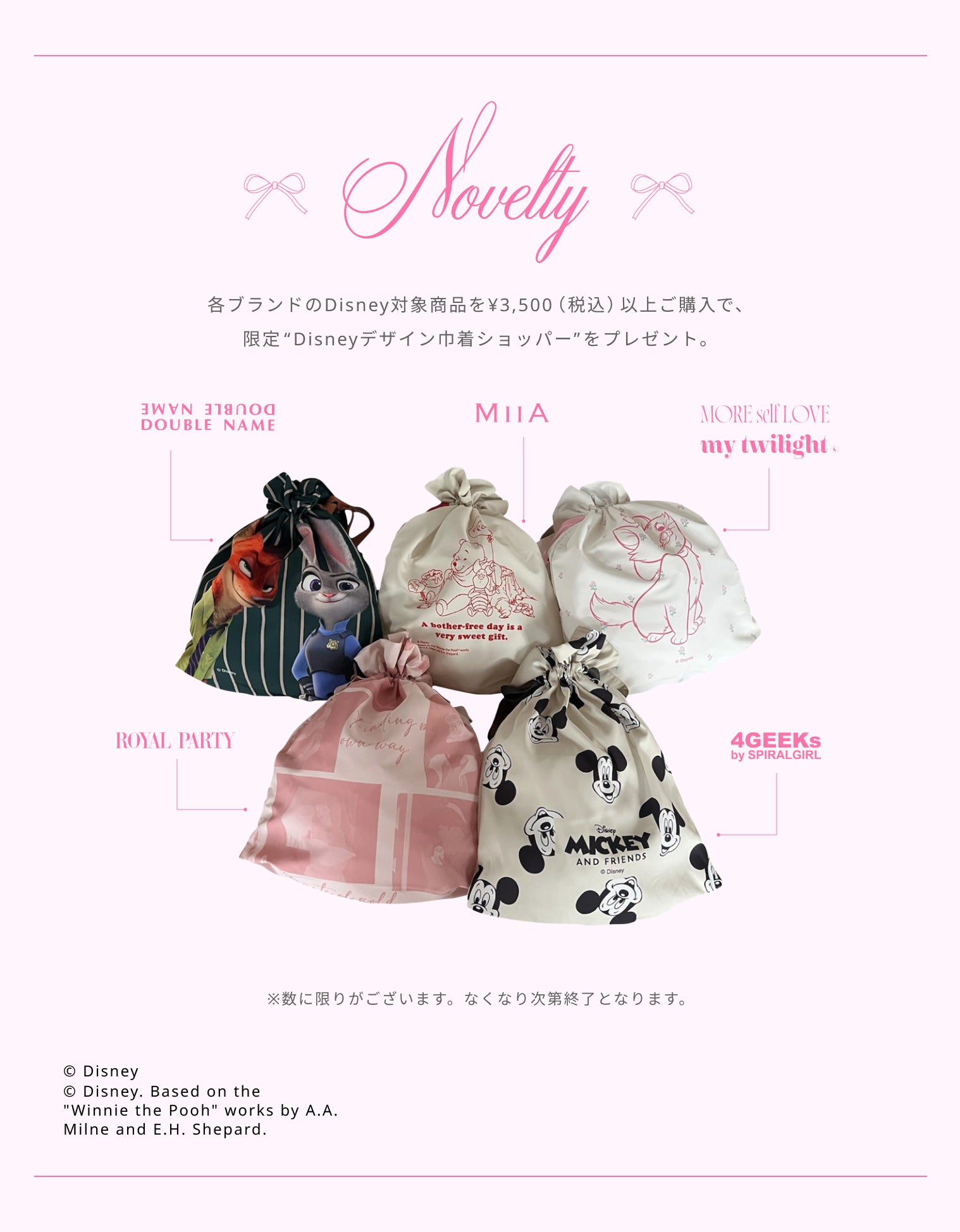 各ブランドのDisney対象商品を¥3,500(税込)以上ご購入で、限定“Disneyデザイン巾着ショッパー”を