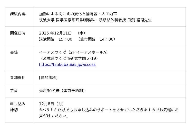 なお、本講座開催時は、別会場(イーアスホールB)にて「パリミキ『聞こえる喜び、感じる安心』補聴器体験会が開催されます。
