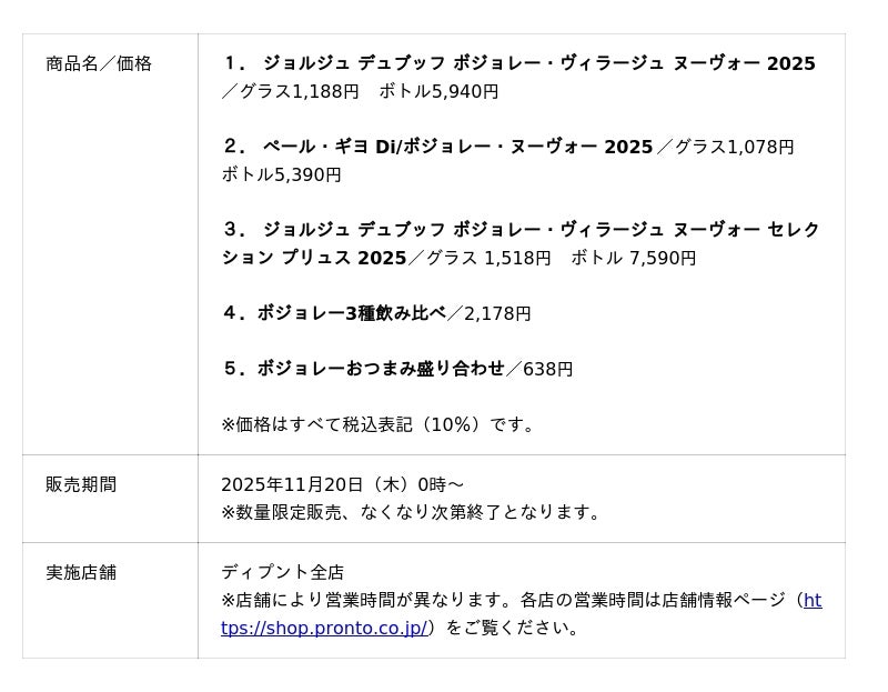 飲食チェーン「PRONTO(プロント)」を展開する株式会社プロントコーポレーション(本社:東京都港区、代表取締役社長:杉山和弘)は、『ワインの酒場。Di PUNTO(以下、ディプント)』にて「ボジョレー・ヌーヴォー」を2025年11月20日(木)より発売いたします。