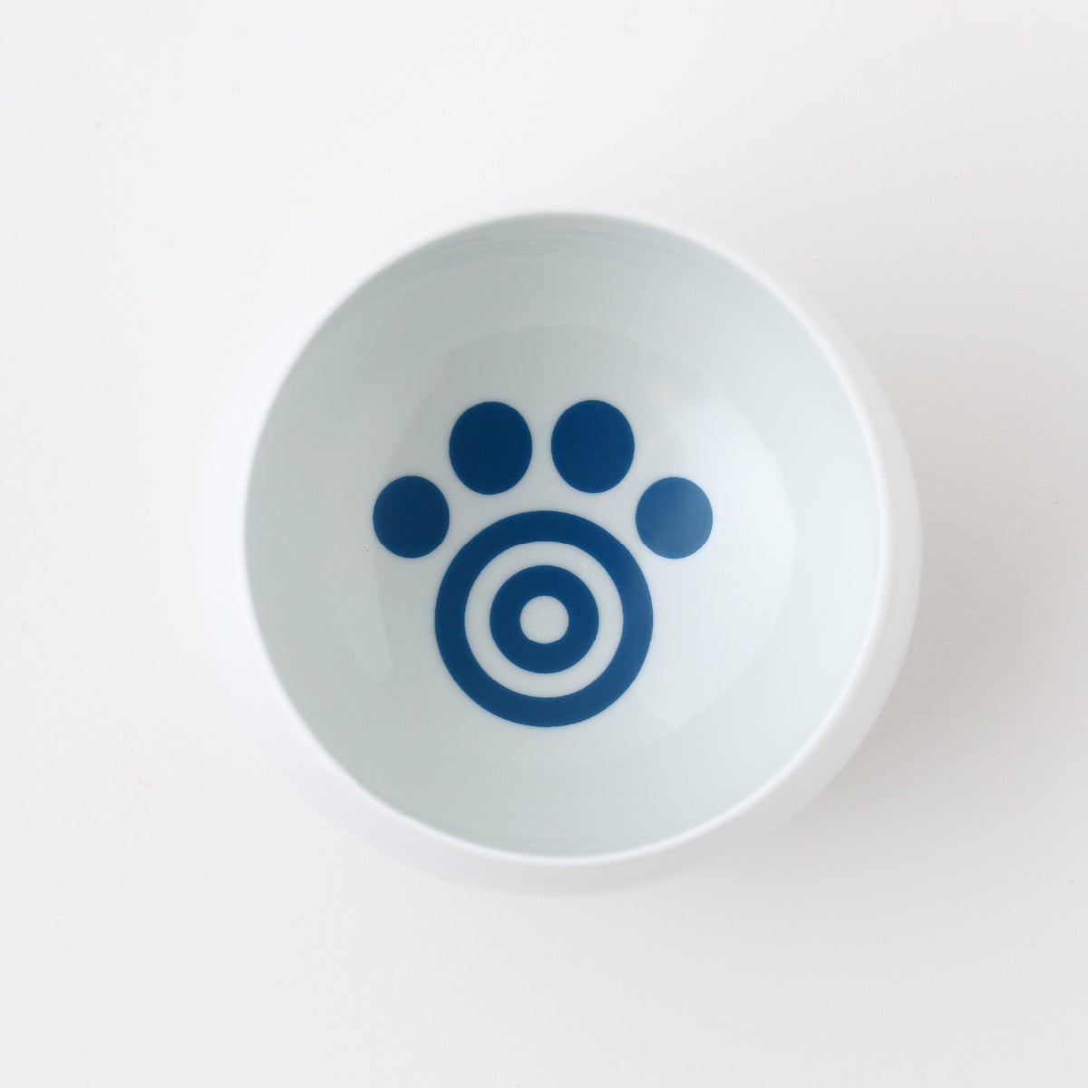 蛇の目のデザイン「見込み(底)部分には、青い二重丸が描かれた伝統的な「蛇の目」模様を採用しました。蛇の目は日本酒の色や透明度の違いがはっきりと映える模様とのことで、公式の「利き酒」などが必要な場面で古くから使われています。日本酒を視覚的にも評価してほしいとの思いから、この柄を採用しています。さらにただ楽しむだけでなく、「日本酒を飲む時間をもっとのんびりと楽しいものにしてほしい」という思いから、蛇の目模様を肉球にアレンジしました。