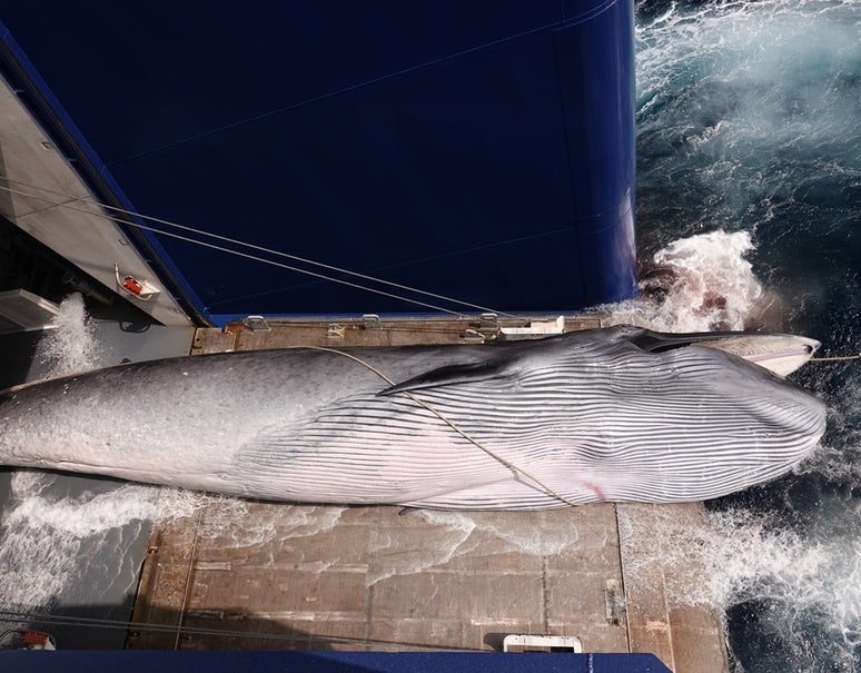 世界最大のシロナガスクジラの近縁種であるナガスクジラ。その肉質はもっちりときめ細かく、上質な脂がのります。今回は共同船舶の協力により、上質な尾の身の優先確保が実現しました。