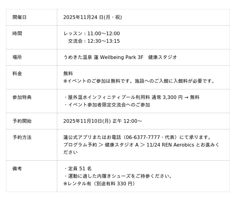 「うめきた温泉 蓮 Wellbeing Park」(総支配人:藤立 達哉、所在地:大阪市)は2025年11月24日(月・祝)にエアロビクスの人気インストラクター2名の特別コラボイベント 「REN Aerobics エアロビクス Vol.1」 を開催いたします。