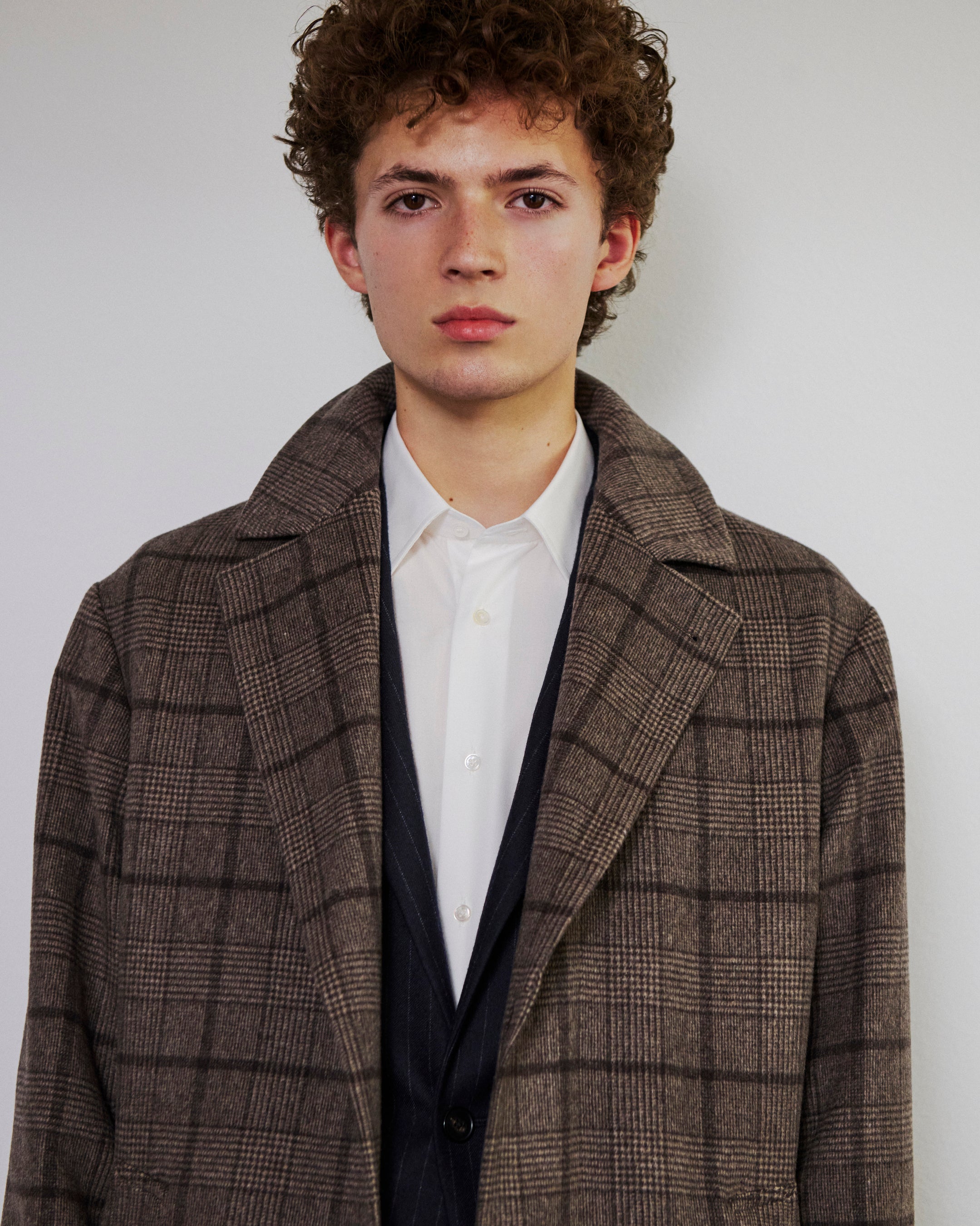 「春を迎える朝」をテーマに、軽やかなグレーやダークブルーのセットアップを中心に構成。冬の終わりから春の始まりまで長く楽しめる、軽快で清潔感のあるスタイルを表現しています。使用するのは、スーツ見えするウール混ジャージーと、柔らかく動きやすいウォッシャブルウールの2生地。季節の変わり目から快適に過ごせる、軽やかで洗練されたセットアップスタイルを提案しています。
