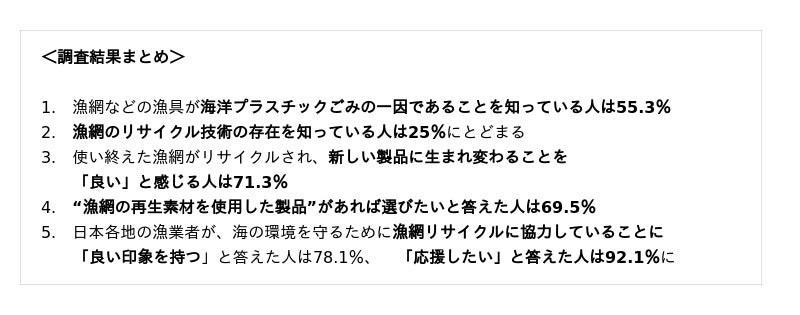 今回の調査結果は、多くの人々が漁業者の努力やリサイクルの可能性に共感していることを示しました。これを励みに、より多くの漁業者・企業・消費者と共に、日本から世界へ広げていきたいと考えています。