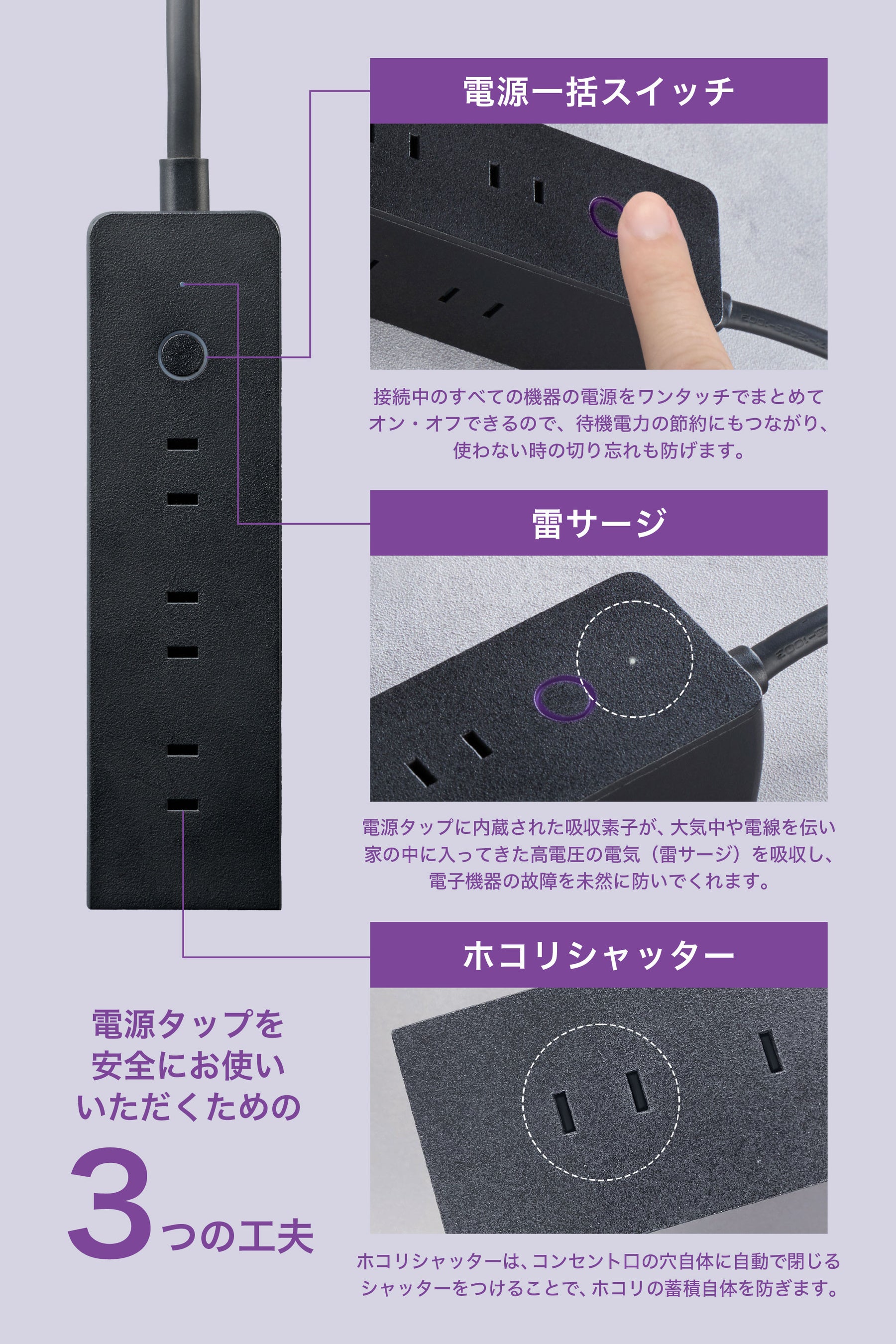 本製品は、67W USB-C充電器・USB-C内蔵コードリール(68cm)・ACコンセント×6(最大7口)を一体化した電源タップです。USB-C/USB-Aで最大3台の同時充電に対応し、「NovaIntelligence」が最適な電力配分を自動で行います。雷サージ・ホコリシャッター・電源一括スイッチなど安全機能も搭載し、シボ加工の筐体で長く美しく使える設計です。2mのスイングプラグ付きケーブルで取り回しもよく、リビングからデスクまでどんな空間にも自然に馴染む、多機能電源タップです。