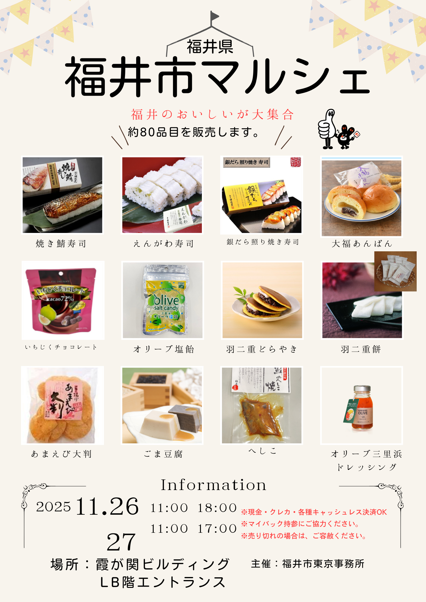 首都圏において福井市の魅力を発信するため、三井不動産ビルマネジメント株式会社が運営・管理する「霞が関ビルディング」にて 『福井市マルシェ』 を開催します。