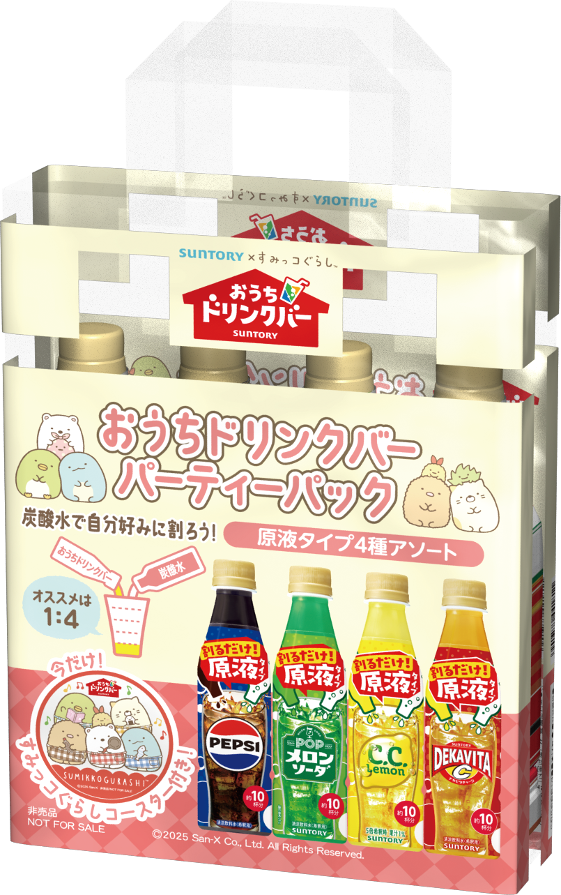 サンエックス株式会社(本社:東京都千代田区)は、サントリー食品インターナショナル株式会社(所在:東京都港区)とコラボレーションした、「すみっコぐらし」オリジナルラバーコースター付きの「おうちドリンクバー 4種アソートパーティーパック」を12月2日(火)から全国で期間限定発売されることをお知らせします。また、12月1日(月)より、「すみっコぐらし」オリジナルホームパーティーグッズなどが当たるキャンペーンを実施します。