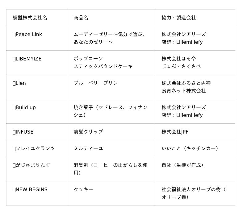 模擬株式会社8社による、物販8店舗の出店と、縁日などのイベントを開催します。生徒が考案した商品名や、フレーバーなど、工夫と個性豊かな商品を、ぜひお楽しみください。