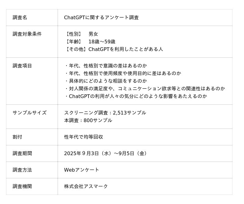 そこで今回は、ChatGPTに対する意識や利用の実態を明らかにするため、『ChatGPTの利用目的』や『具体的な相談内容』、『コミュニケーション欲求の程度』といった設問を含むアンケートを実施しました。